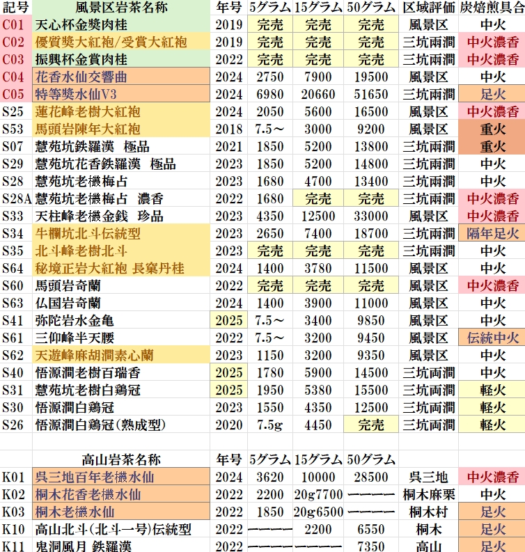 主要武夷岩茶の価格表 2025年11月19日更新
